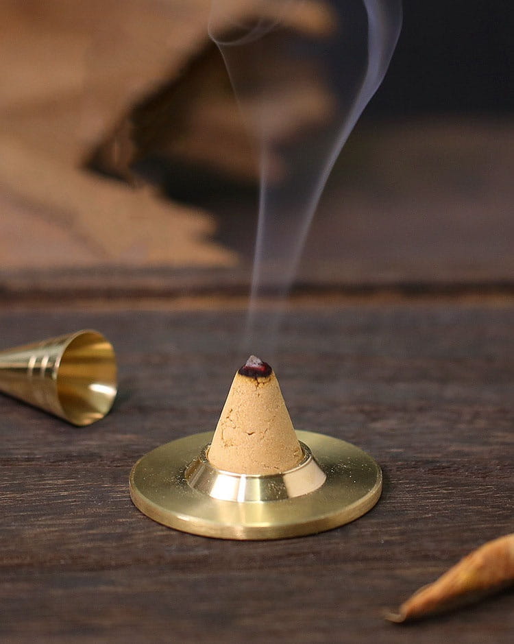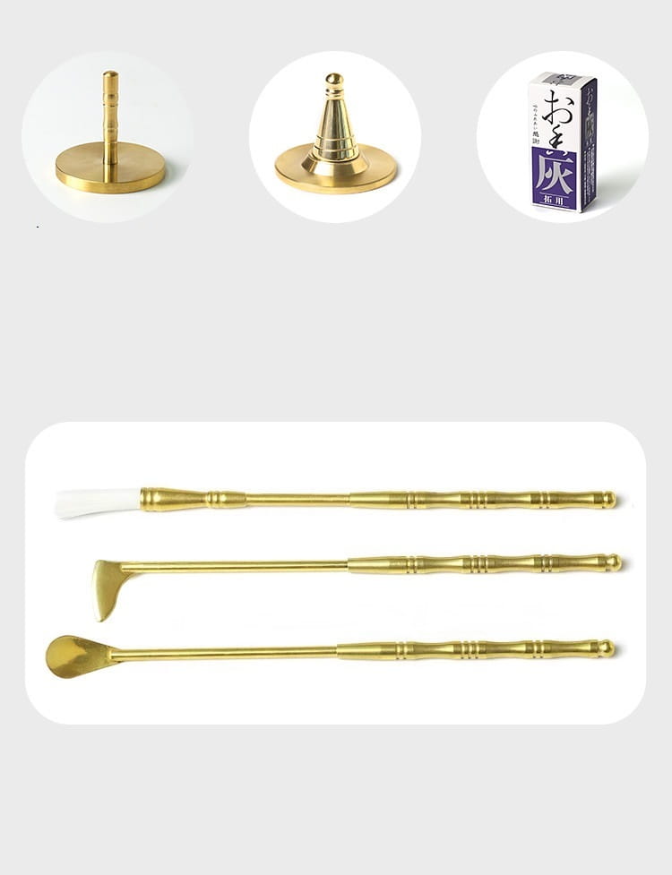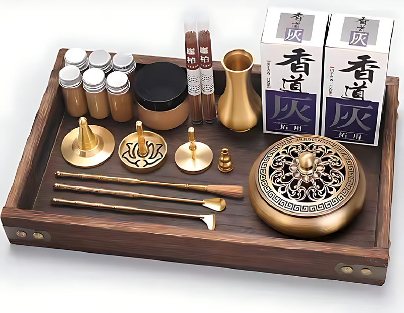 Zawartość zestawu: Urna na popiół, kadzidła proszkowe, pałeczki kadzideł, małe pojemniki na kadzidło, waza, narzędzia do ceremonii (łopatka, szpachelka, miarka, forma), drewniana taca do przechowywania.