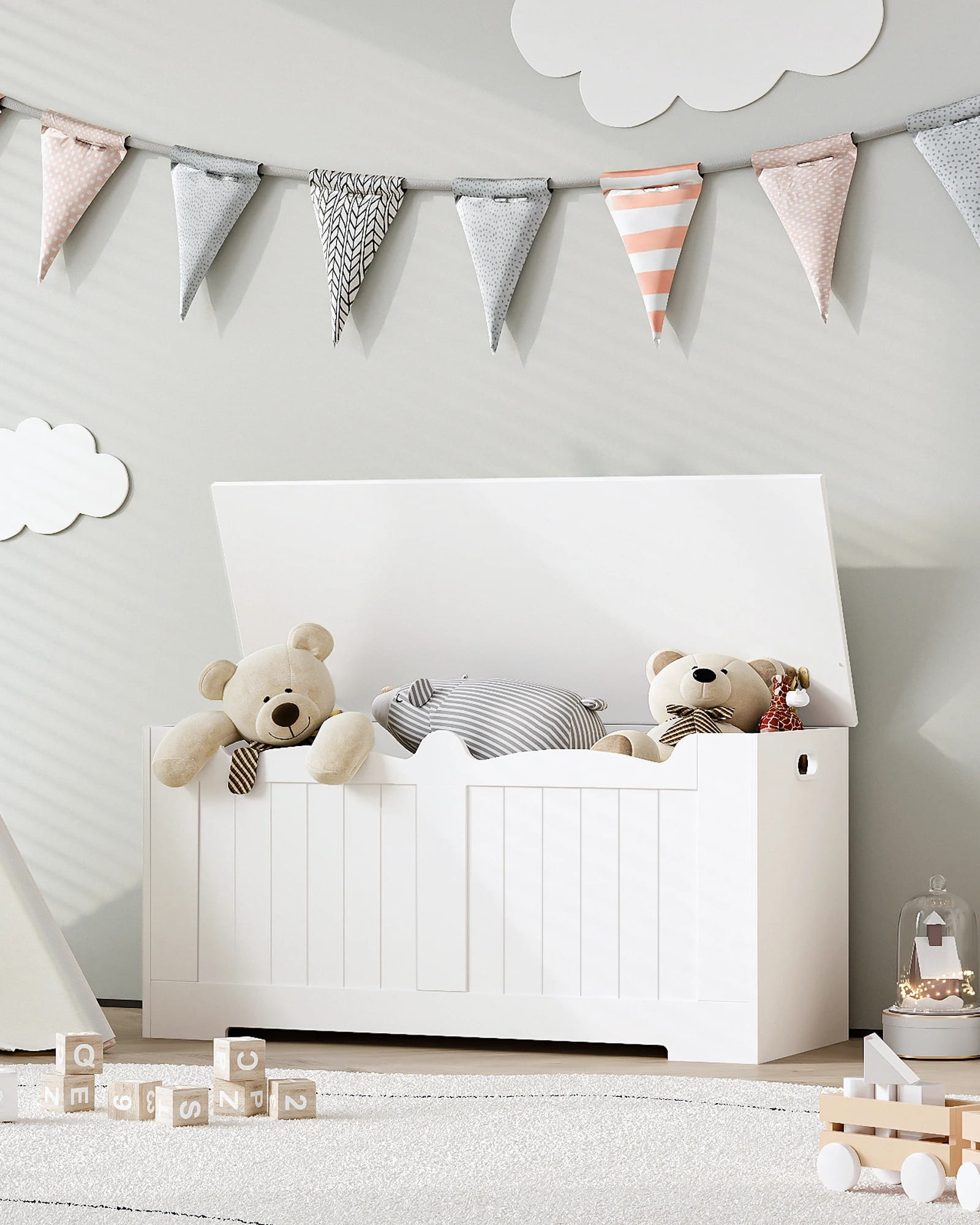 Biała Skrzynia na Zabawki i Siedzisko 2w1 – Drewniany Kufer do Przechowywania, Ławka do Przedpokoju i Salonu