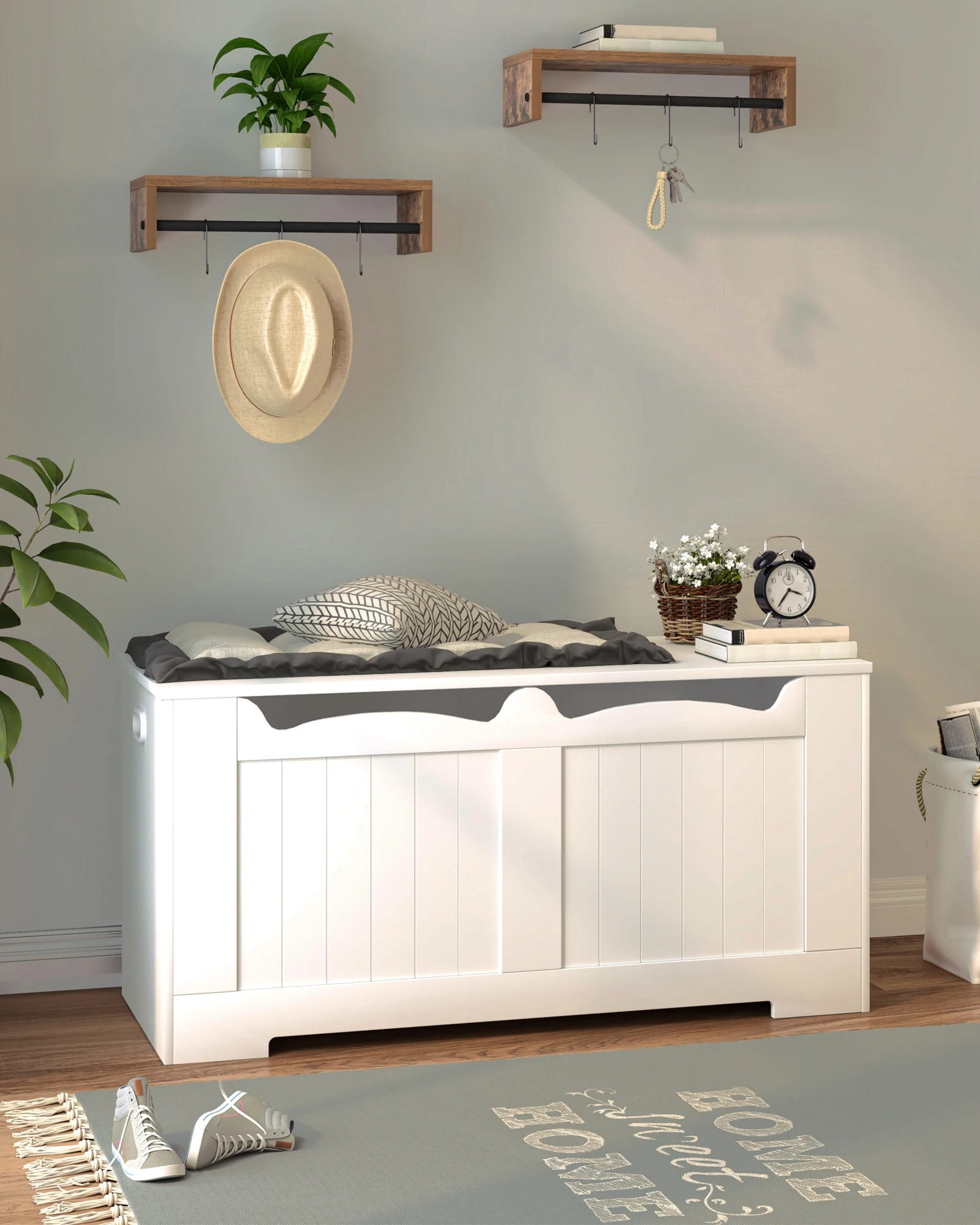 Wytrzymała konstrukcja: Wykonana z wysokiej jakości płyty o grubości 15 mm. Górna pokrywa wytrzymuje obciążenie do 150 kg (330 funtów), co pozwala na swobodne korzystanie z niej jako wygodnej ławki.