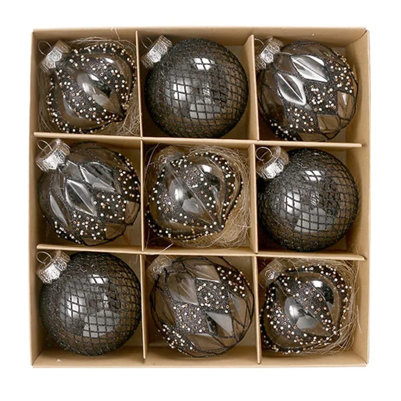 Nadaj swojej choince wyjątkowego charakteru dzięki eleganckim czarnym bombkom choinkowym. Ten zestaw 9 sztuk został wykonany ze szkła i ozdobiony połyskującym brokatem oraz geometrycznymi wzorami, które pięknie odbijają światło lampek choinkowych.