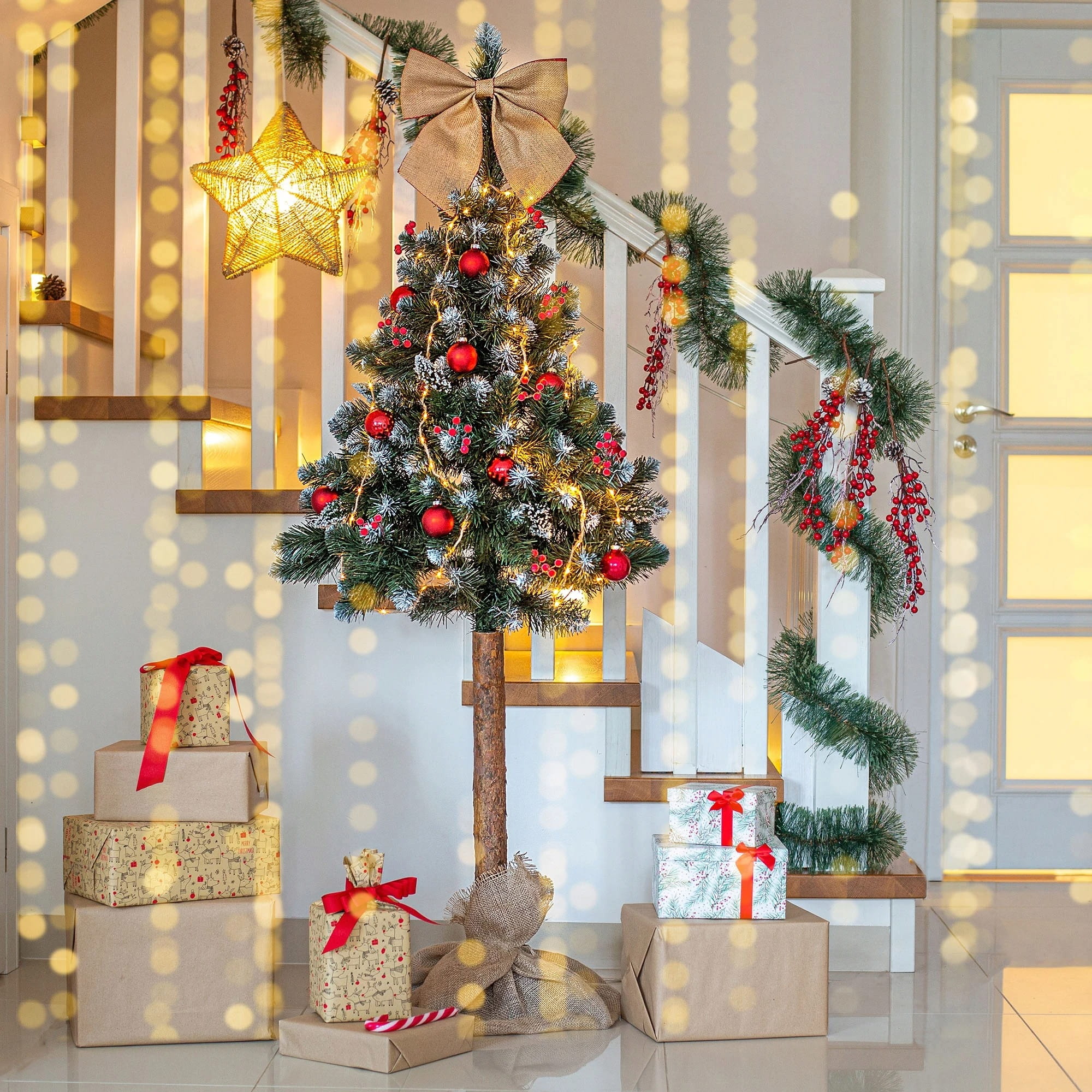 Montaż choinki jest szybki i prosty – wystarczy połączyć elementy, a stabilna podstawa z naturalnym pniem zapewnia trwałość i elegancję. Choinka zajmuje mało miejsca, dzięki czemu idealnie sprawdzi się w salonie, biurze czy restauracji.