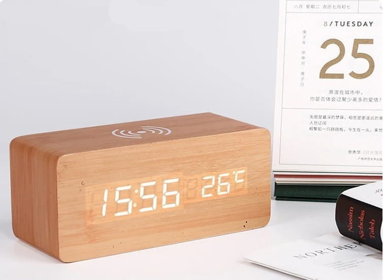 Cyfrowy Budzik Drewniany z Ładowarką Bezprzewodową