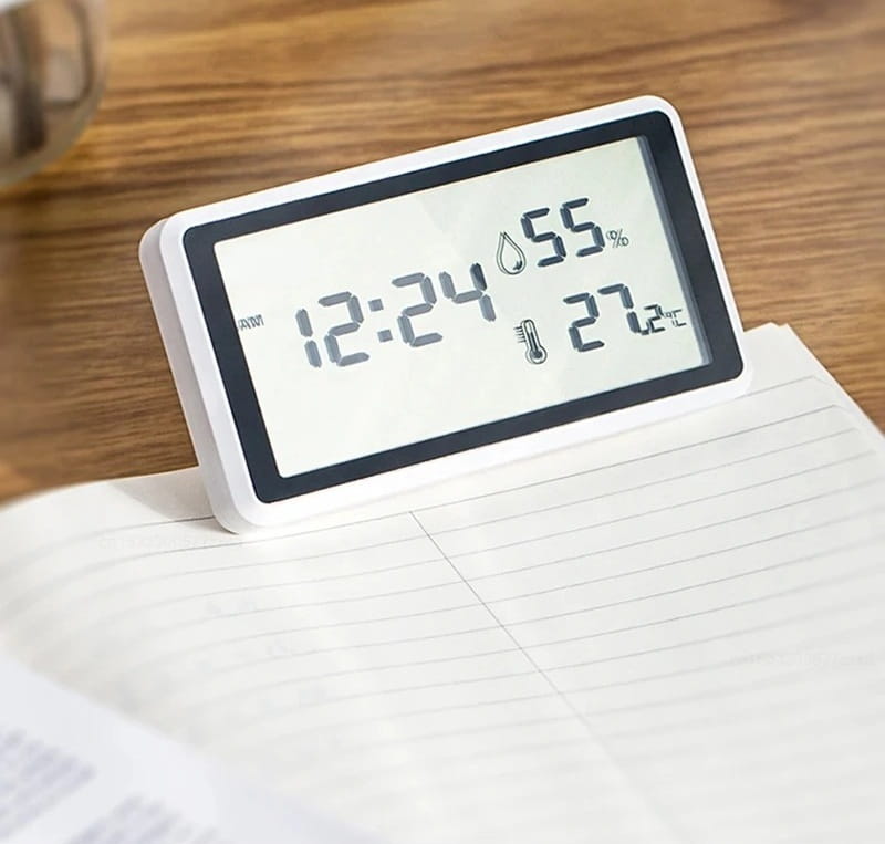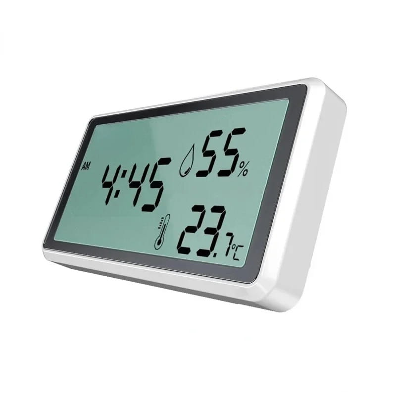 - Trzy Funkcje w Jednym: Na dużym, czytelnym wyświetlaczu LCD jednocześnie zobaczysz aktualną temperaturę (w stopniach Celsjusza), wilgotność powietrza (w procentach) oraz Która godzina. Wszystkie kluczowe informacje na jednym ekranie, co zapewnia przejrzystość i wygodę użytkowania.