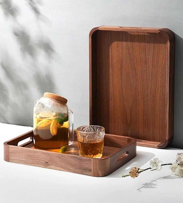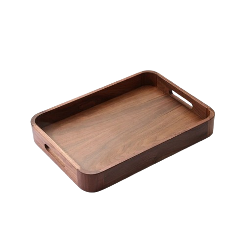 Elegancka, prostokątna taca stołowa z drewna orzecha włoskiego to idealny dodatek do każdego wnętrza. Wyposażona w praktyczne uchwyty, łączy funkcjonalność z klasycznym, naturalnym designem.