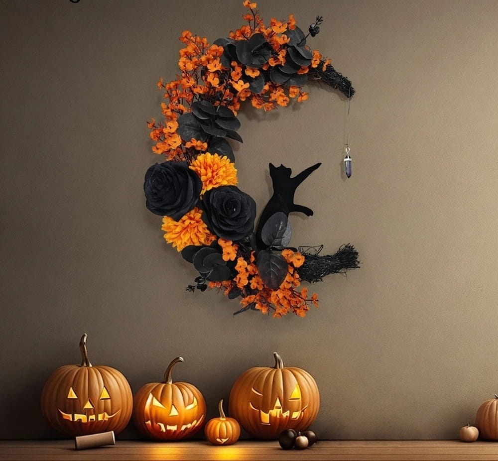 Styl: Girlanda Halloween w kształcie półksiężyca, ozdobiona czarnymi i pomarańczowymi kwiatami (sztucznymi) oraz liśćmi.