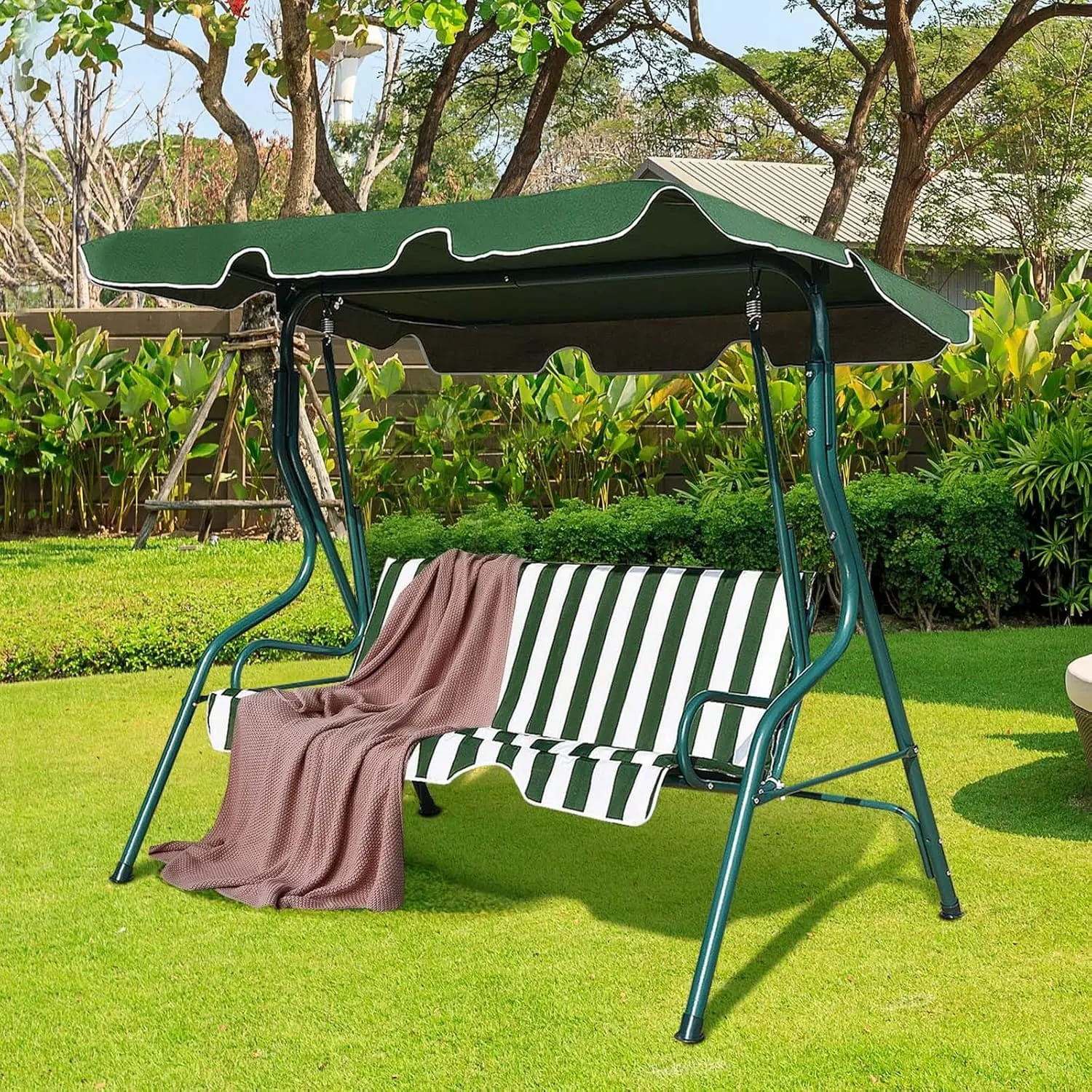 Klasyczny Styl Hollywood: Kultowe pasy i prosta forma sprawiają, że huśtawka staje się centralnym punktem ogrodu, dodając mu uroku w stylu retro.