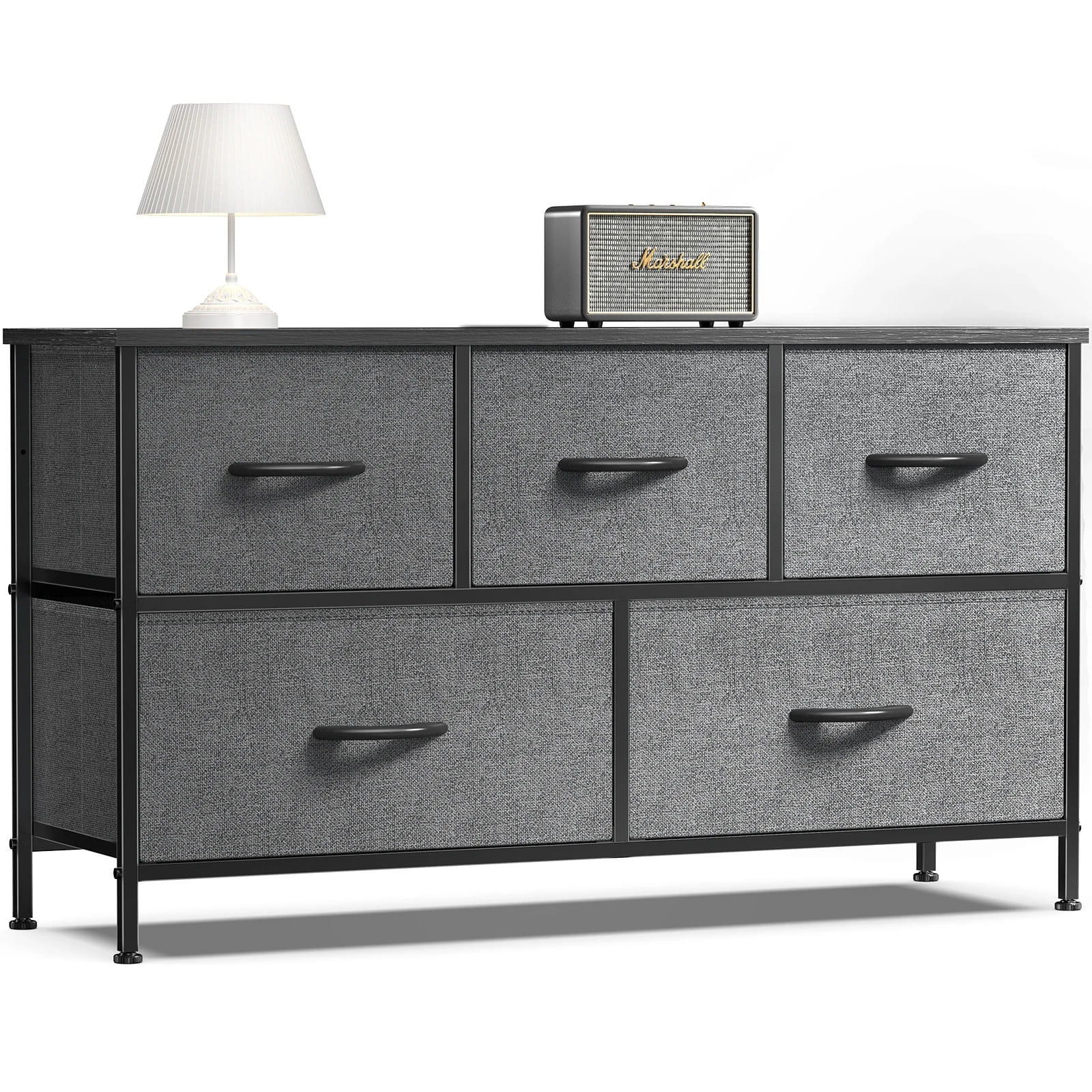 Komoda łączy wytrzymałą metalową ramę z wysokiej jakości składanymi szufladami z tkaniny oraz solidnym blatem MDF . Jest to mebel lekki, a jednocześnie stabilny i bezpieczny.