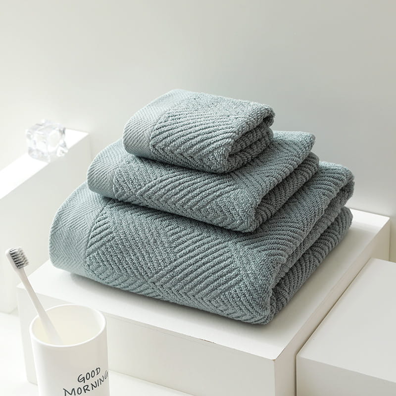 Ręczniki charakteryzują się gęstym, miękkim splotem, który zapewnia wysoką chłonność i komfort użytkowania. Unikalny wzór, w postaci delikatnych, geometrycznych rombów, przełamuje gładką teksturę i dodaje im wyrafinowanego charakteru. Wykonane z wysokiej jakości bawełny, są przyjazne dla skóry, a ich miękkość utrzyma się przez wiele prań. Idealne zarówno do codziennego użytku, jak i jako element wyposażenia łazienki w stylu spa.