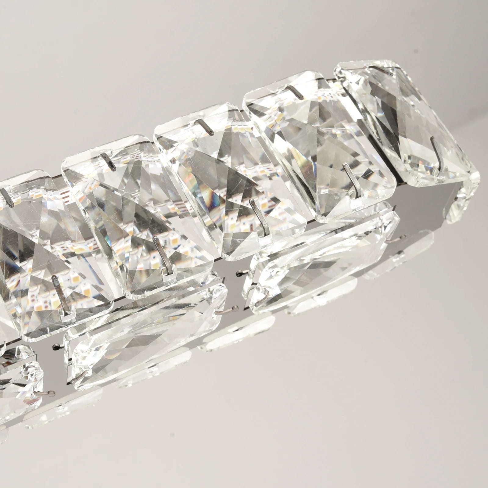 Ten nowoczesny, podwójny żyrandol liniowy to idealne rozwiązanie do oświetlenia jadalni, kuchni nad wyspą lub długiego stołu oraz salonu. Łączy w sobie błyszczące, fasetowane kryształy z polerowaną chromowaną bazą, tworząc luksusowy i elegancki punkt centralny w każdym nowoczesnym wnętrzu.