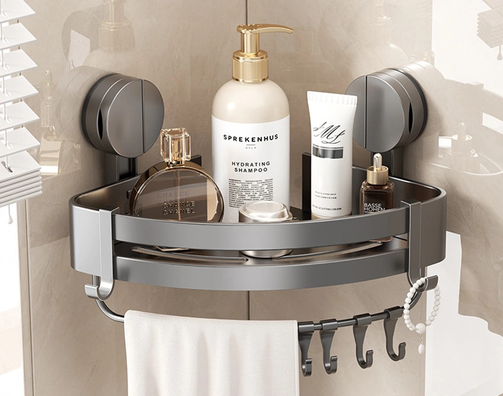 Narożna półka prysznicowa na kosmetyki szara z haczykami