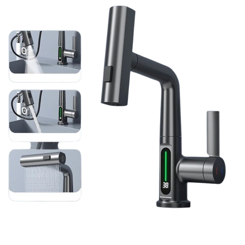 Nowoczesna Bateria Umywalkowa z Wyświetlaczem LED i Wyciąganą Wylewką 3 Tryby Pracy Regulacja Wysokości