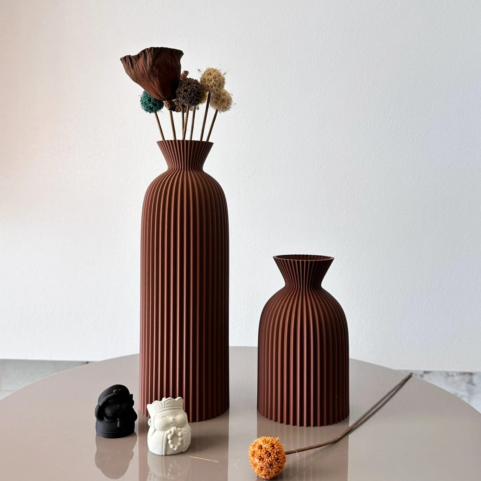 Dodaj elegancji i nowoczesnego stylu do swojego wnętrza dzięki zestawowi dwóch ryflowanych wazonów. Unikalna tekstura i geometryczny kształt sprawiają, że są idealne do suszonych kwiatów, traw pampasowych lub jako samodzielna dekoracja. Dostępne w modnych kolorach: Beż, Brąz, Zieleń, Czarny, Jasny Szary.