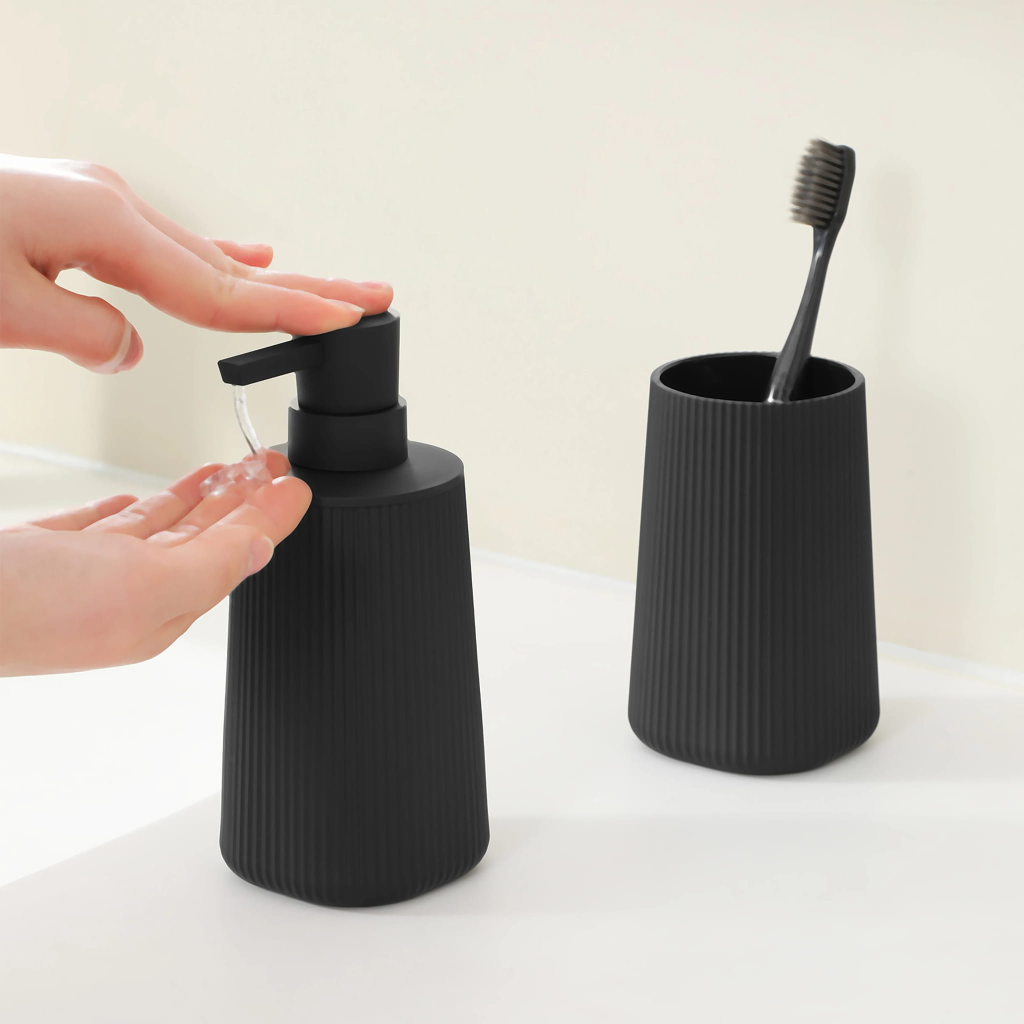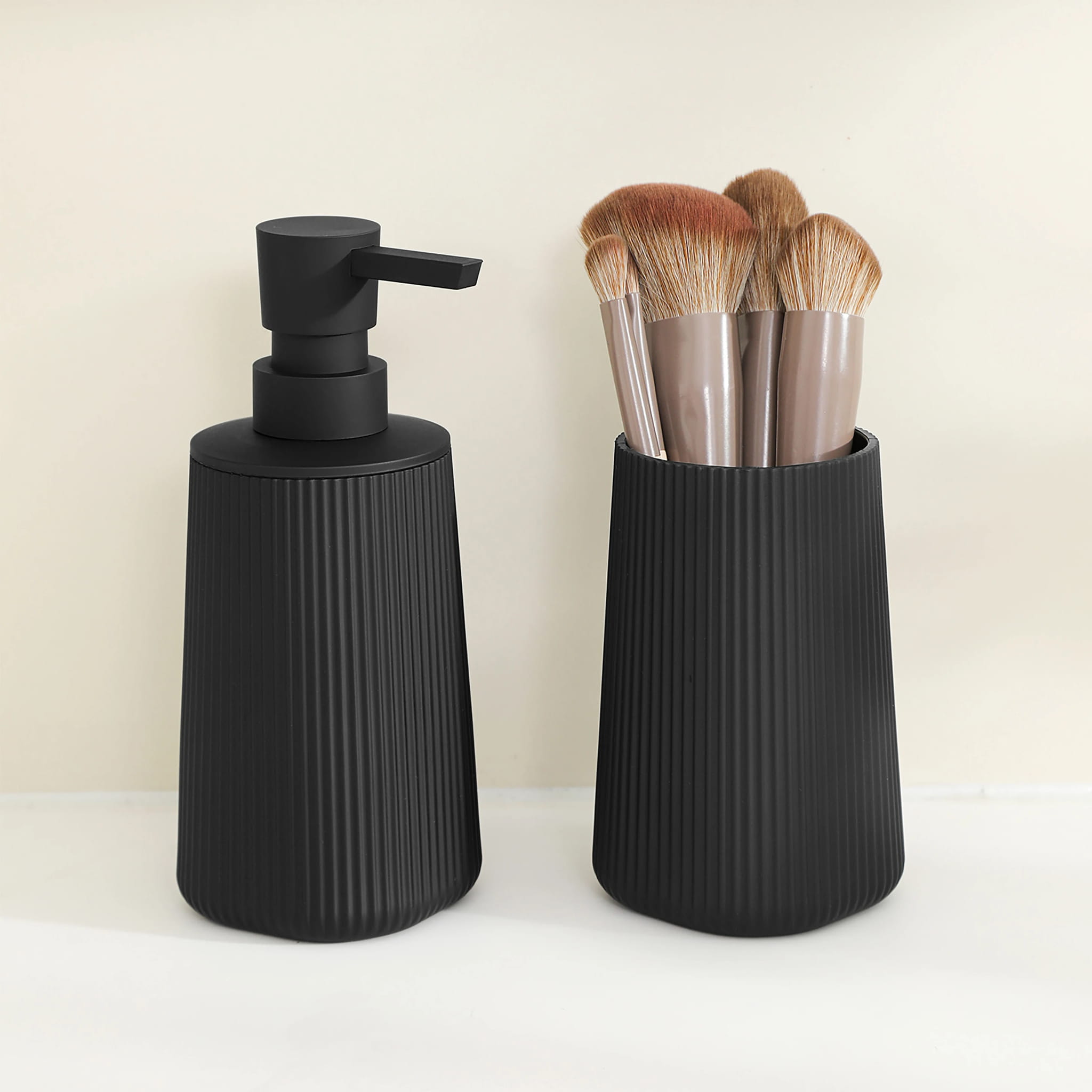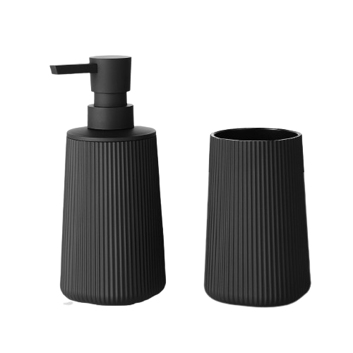 - Elegancki Design: Dozownik i kubek charakteryzują się minimalistycznym designem z subtelnymi, pionowymi żłobieniami, które dodają im tekstury i nowoczesnego wyglądu. Głęboka matowa czerń nadaje im luksusowy i ponadczasowy charakter.
