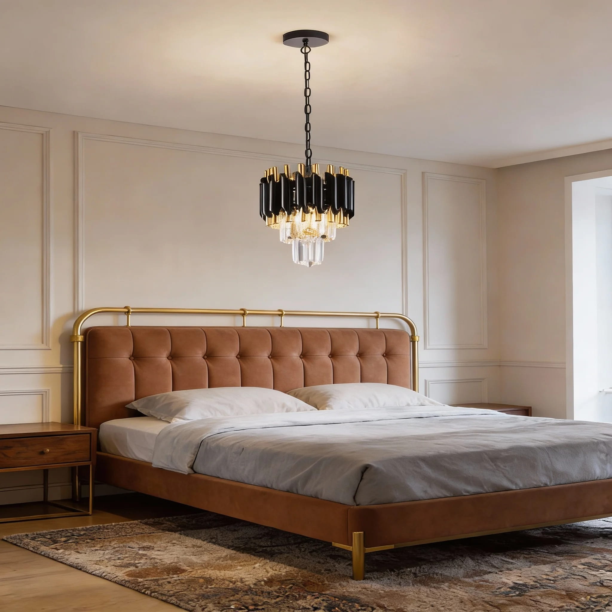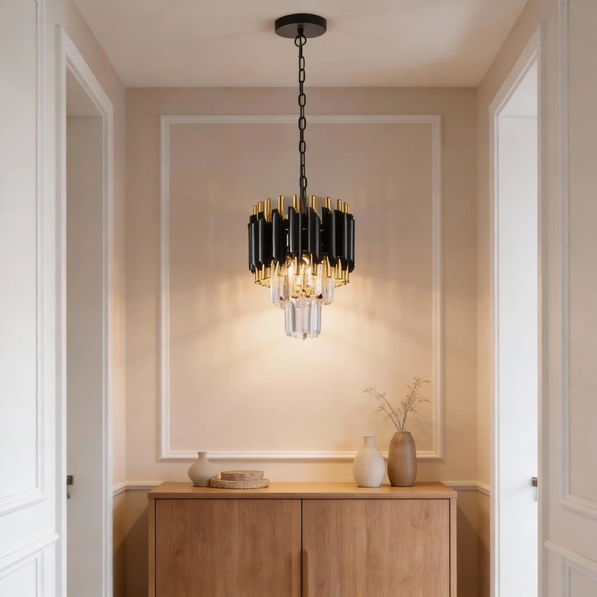 Elegancja spotyka nowoczesność. Ten wyjątkowy, 2-poziomowy mini żyrandol kryształowy to idealne połączenie luksusowego stylu glamour z surowym, nowoczesnym designem. Kontrastowe wykończenie w kolorze głębokiej czerni i szczotkowanego złota sprawia, że lampa staje się centralnym punktem każdego pomieszczenia, od eleganckiego salonu po stylową kuchnię.