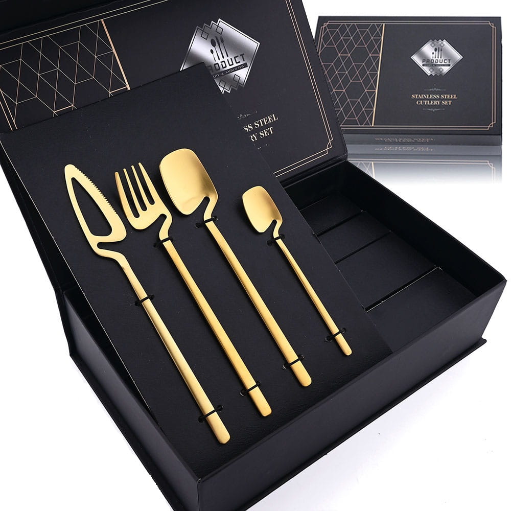 Odkryj nowoczesność na swoim stole dzięki temu 32-częściowemu zestawowi sztućców. Wykonany z wysokiej jakości stali nierdzewnej, w złotym wykończeniu, jest idealnym wyborem dla tych, którzy cenią sobie styl, elegancję i trwałość.