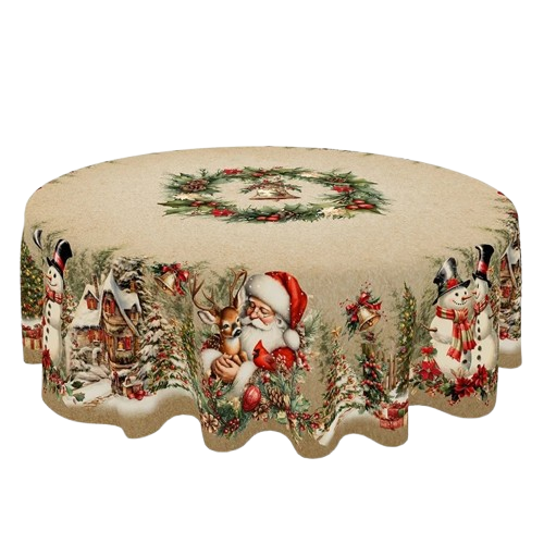 Klasyczny Wzór Świąteczny: Obrus zdobi urocza scena zimowa z Świętym Mikołajem, Bałwankiem i zimowym wiejskim krajobrazem, otoczona motywami wieńca z ostrokrzewu.