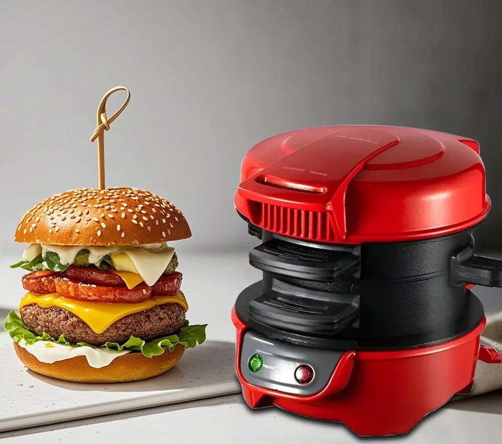 Opiekacz do kanapek i burgerów 3w1 – Mini Grill Elektryczny 800W, Czerwony