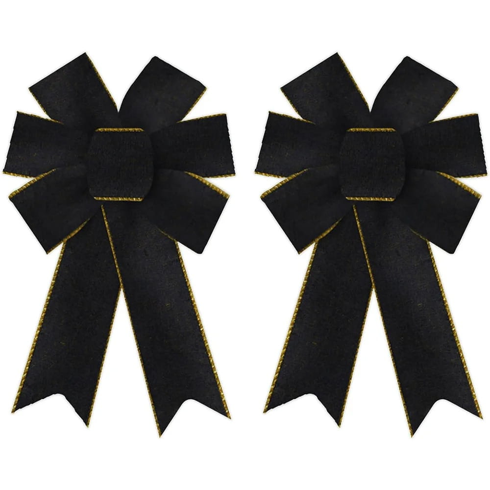 Dodaj odrobinę luksusu i nowoczesnej elegancji do swoich dekoracji! Ten zestaw dwóch średniej wielkości, czarnych kokard welurowych jest idealny do stworzenia stylowego akcentu, który pasuje do każdego wystroju, nie tylko świątecznego. Kokardy wyróżniają się pełnym, warstwowym wyglądem i są wykończone eleganckim złotym splotem na brzegach.