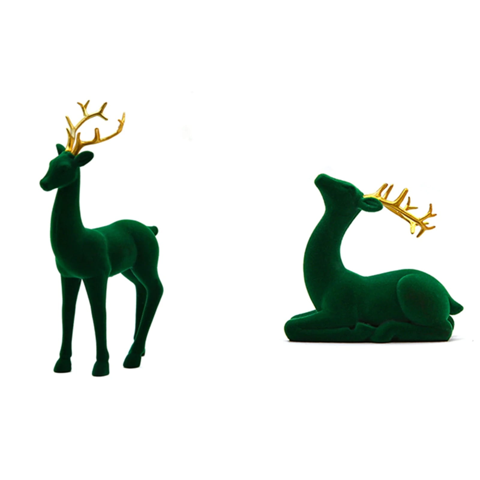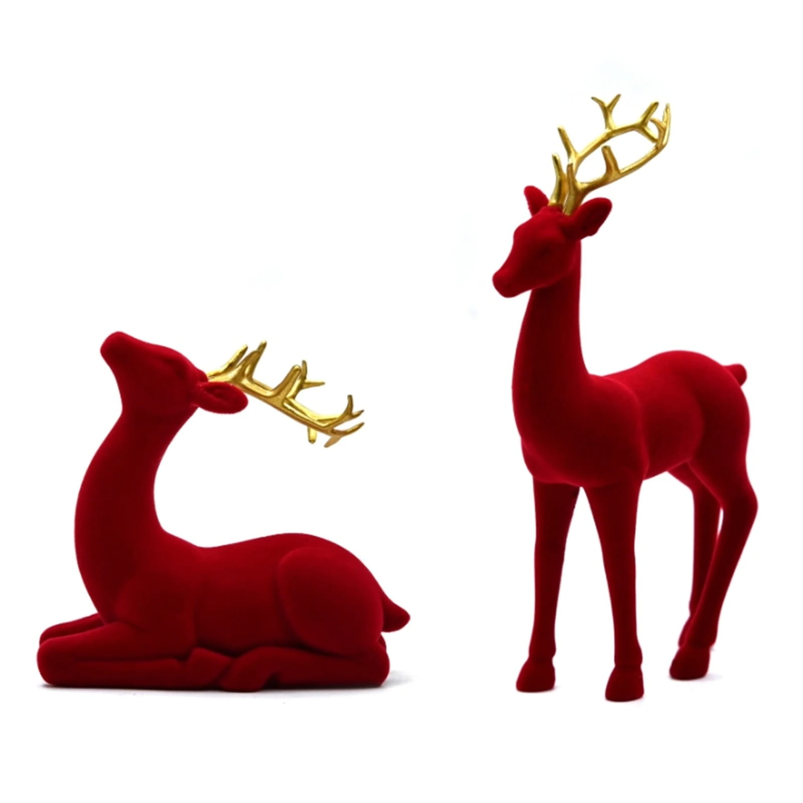 Wprowadź do swojego domu magię Świąt z naszym luksusowym zestawem dwóch flokowanych figurek reniferów. Te urocze dekoracje świąteczne są pokryte miękkim, welurowym flokiem, który nadaje im bogatej tekstury i głębokiego koloru do wyboru klasyczna Czerwień Świąteczna lub leśna Głęboka Zieleń. Złote, lśniące rogi doskonale kontrastują z aksamitną powierzchnią, tworząc elegancki i przyciągający wzrok akcent.