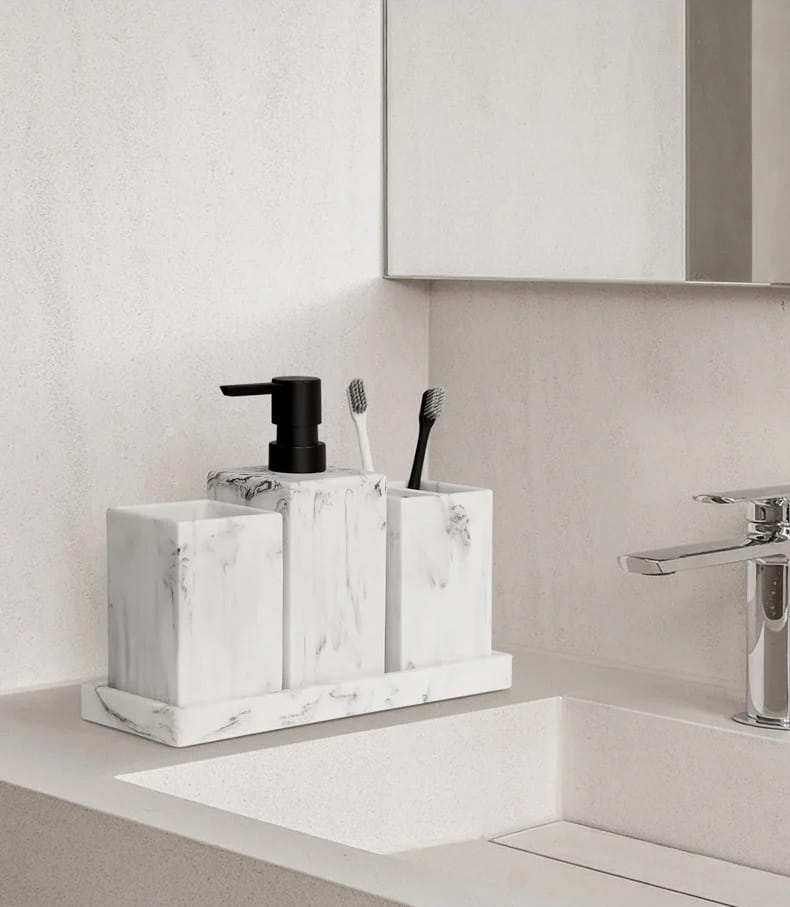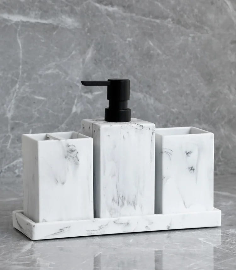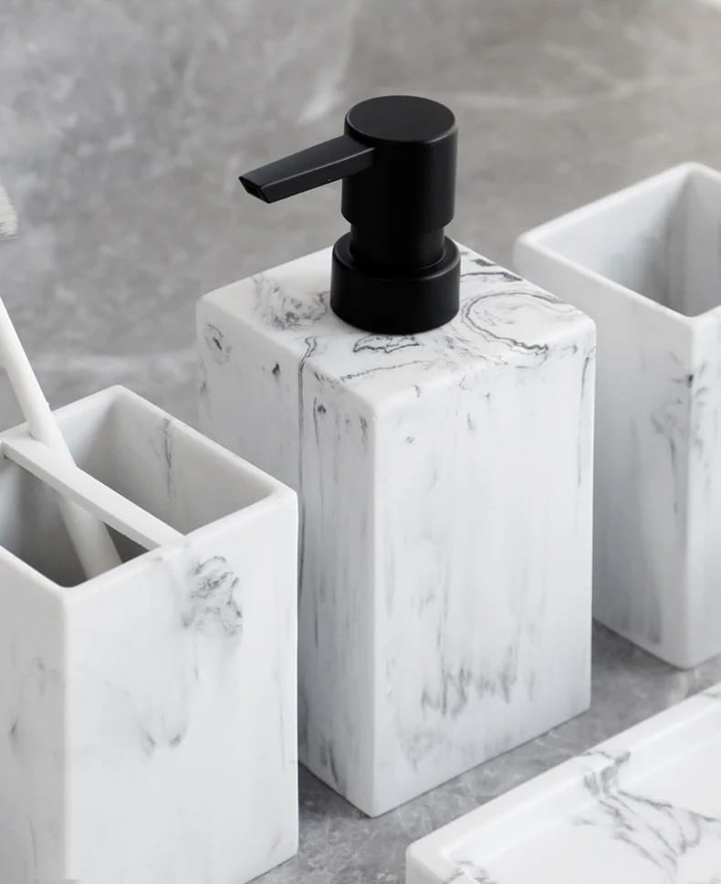 Zestaw Łazienkowy Marmur Biały Dozownik Kubki Taca