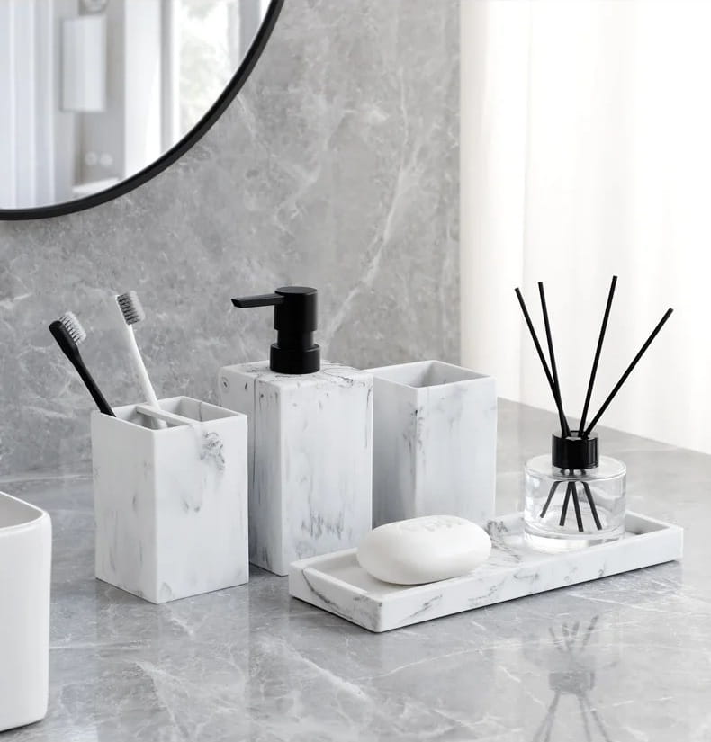Odmień wygląd swojej łazienki dzięki naszemu ekskluzywnemu zestawowi akcesoriów, wykonanemu z wysokiej jakości żywicy z efektem czarnego marmuru. Ten 4-częściowy komplet nie tylko wprowadzi porządek, ale także doda luksusowego i nowoczesnego charakteru Twojej przestrzeni. Idealny dla tych, którzy cenią sobie elegancję i funkcjonalność.
