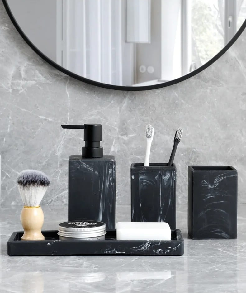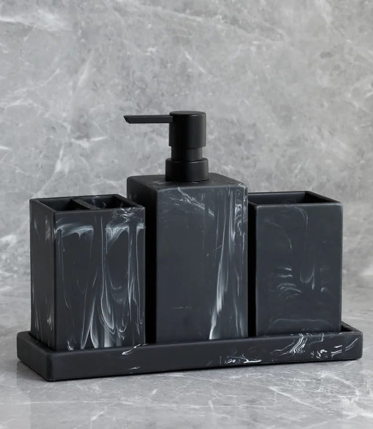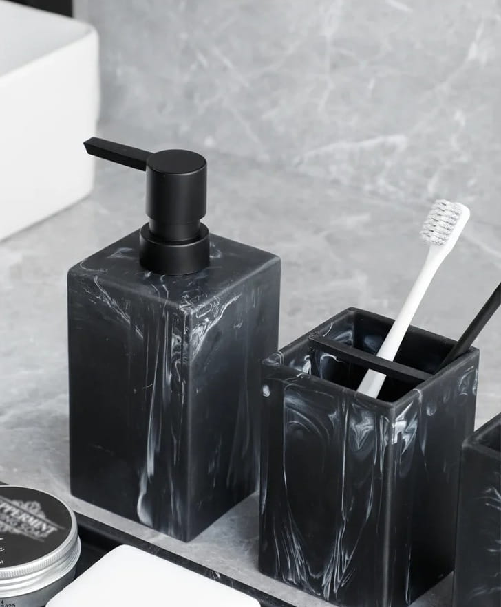 Odmień wygląd swojej łazienki dzięki naszemu ekskluzywnemu zestawowi akcesoriów, wykonanemu z wysokiej jakości żywicy z efektem czarnego marmuru. Ten 4-częściowy komplet nie tylko wprowadzi porządek, ale także doda luksusowego i nowoczesnego charakteru Twojej przestrzeni. Idealny dla tych, którzy cenią sobie elegancję i funkcjonalność.