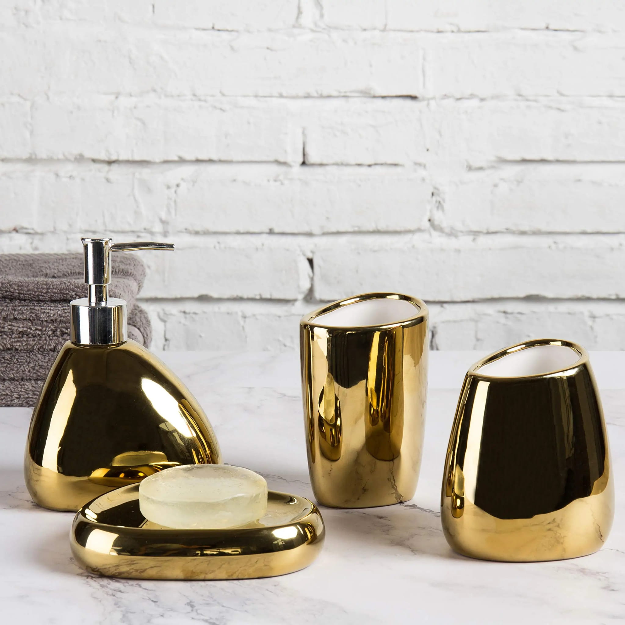 Zestaw wykonano z wysokiej jakości, trwałego materiału, z błyszczącym, złotym wykończeniem, które jest odporne na wilgoć i korozję. Eleganckie, nieregularne kształty dodają mu charakteru, a praktyczne funkcje sprawiają, że korzystanie z niego jest czystą przyjemnością.