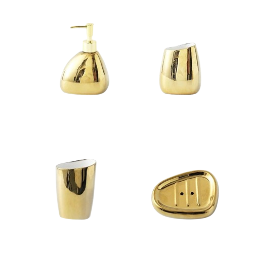 Podaruj swojej łazience luksusowy, lśniący akcent z naszym 4-elementowym złotym zestawem akcesoriów łazienkowych. Zaprojektowany w nowoczesnym i estetycznym stylu, ten komplet sprawi, że Twoje wnętrze zyska unikalny, elegancki wygląd.