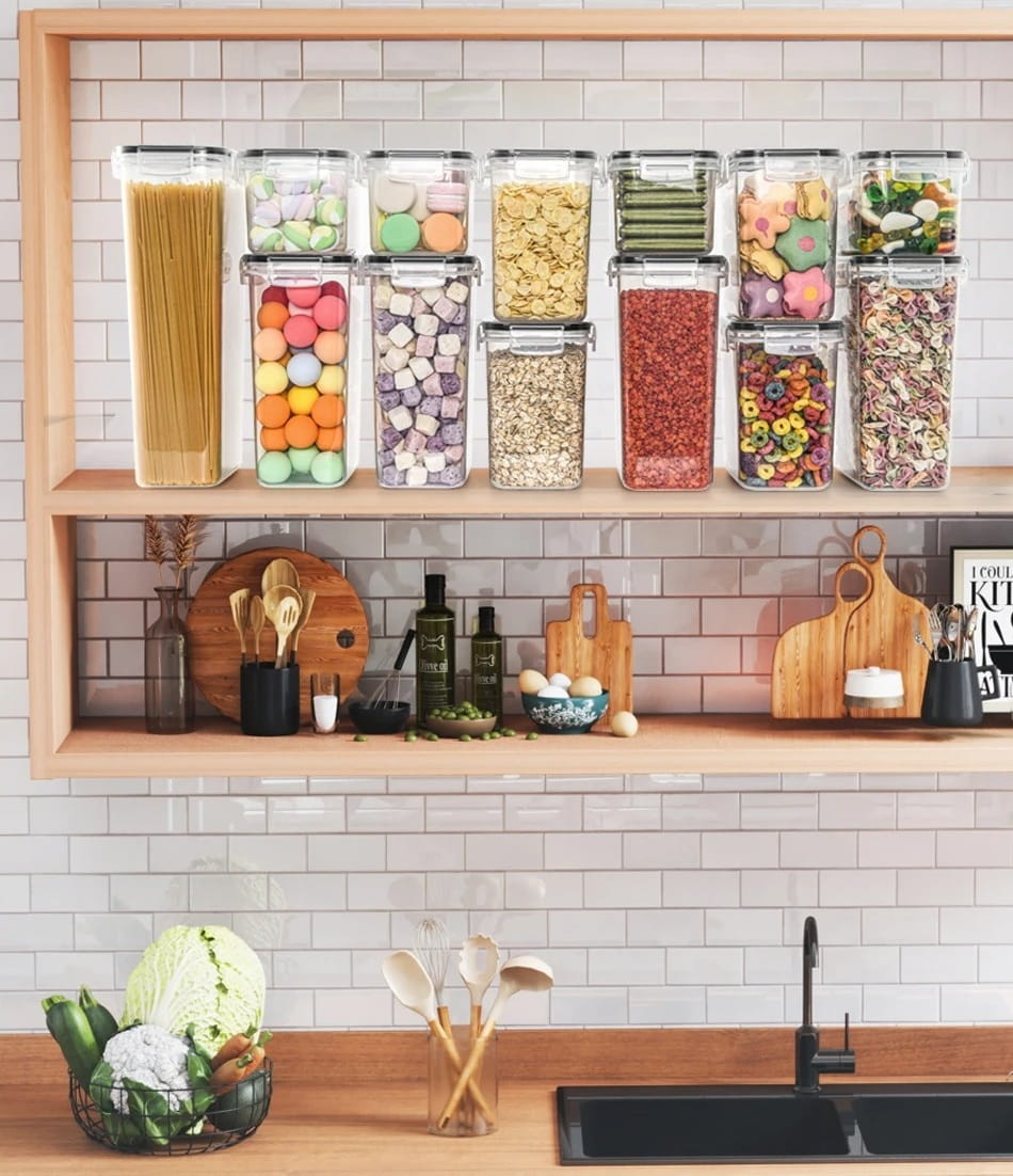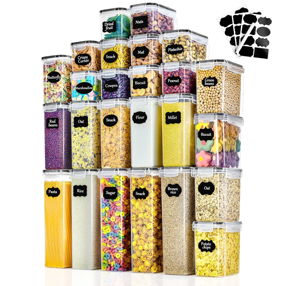 Utrzymuj porządek w kuchni z praktycznym zestawem 24 pojemników na żywność o różnych pojemnościach. Idealne do przechowywania makaronu, kaszy, płatków, kawy, przypraw, bakalii i innych produktów spożywczych.
