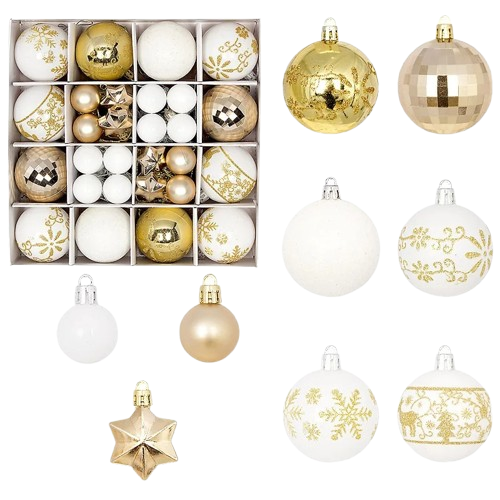 Wprowadź do swojego domu magię świąt dzięki eleganckiemu zestawowi 44 bombek choinkowych w kolorach złotym i białym. Wykonane z wysokiej jakości plastiku odpornego na stłuczenia, są bezpieczne dla dzieci i zwierząt, a jednocześnie pięknie połyskują na choince.